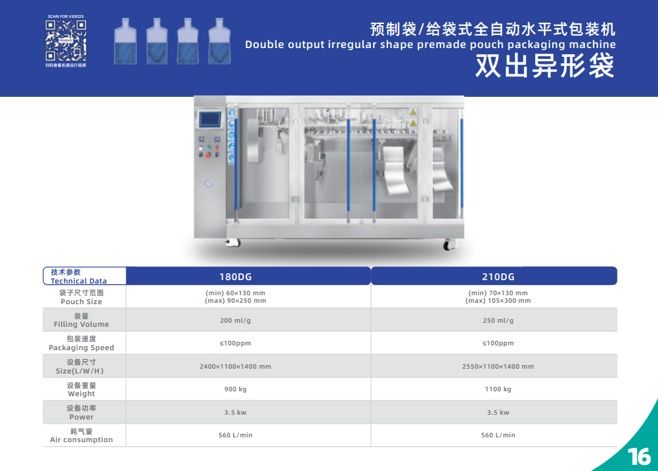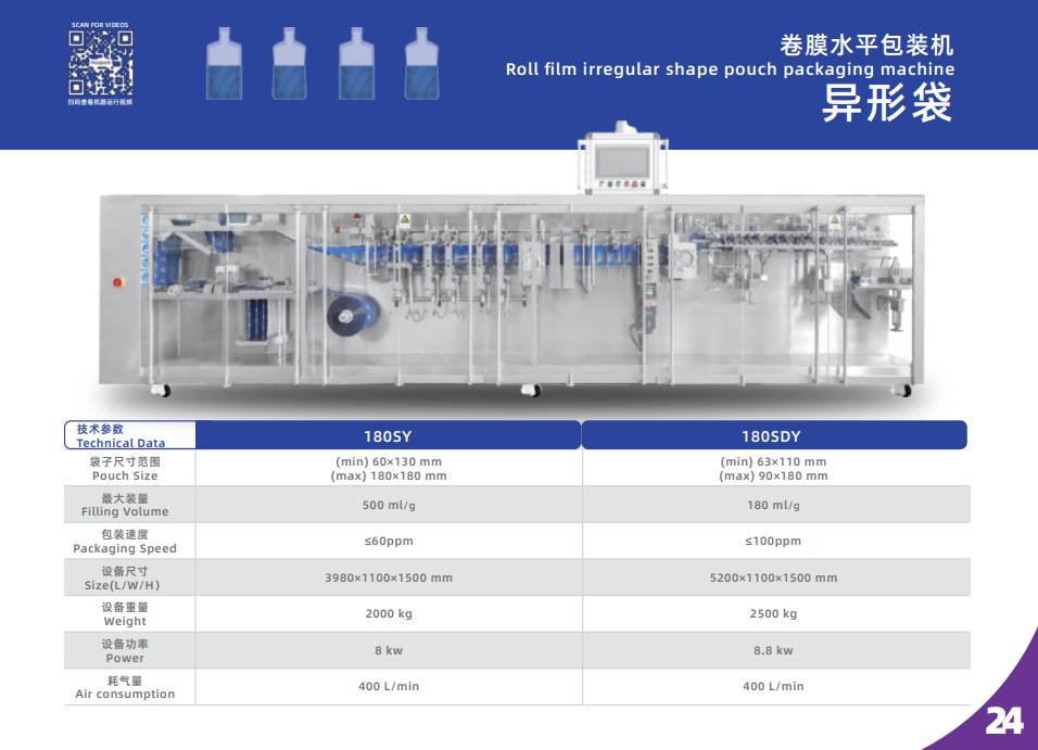 180SDY水平式卷膜異形袋包裝機:適用于大健康、飲品等行業。(如枸杞原漿、刺梨汁、沙棘、藍莓原漿、酵素等)可兼容異形袋、自立袋等袋型。